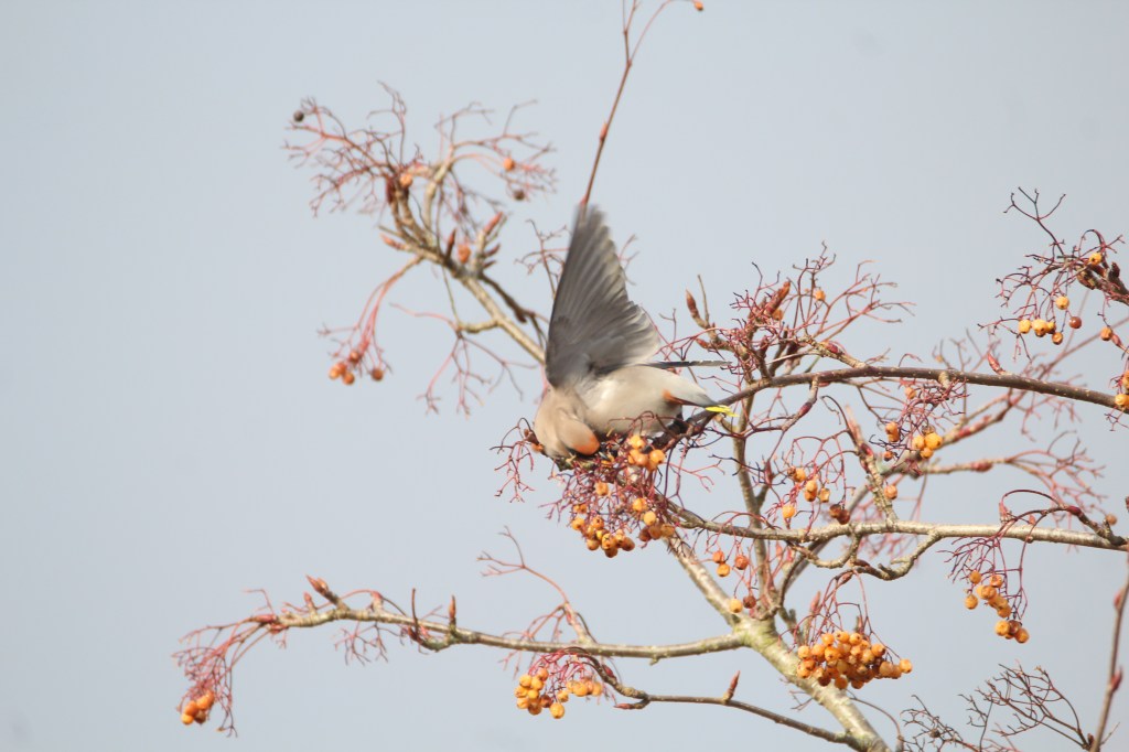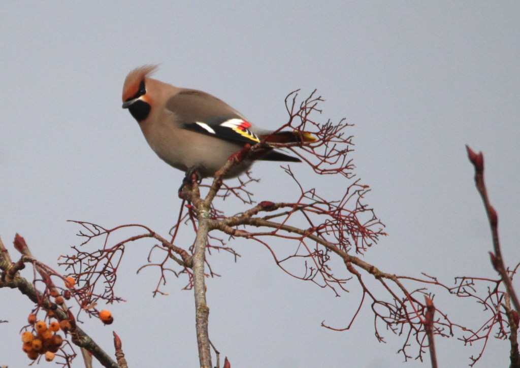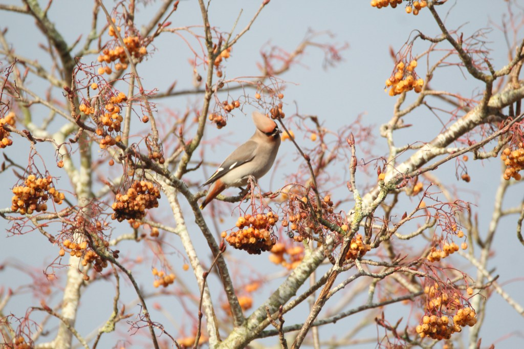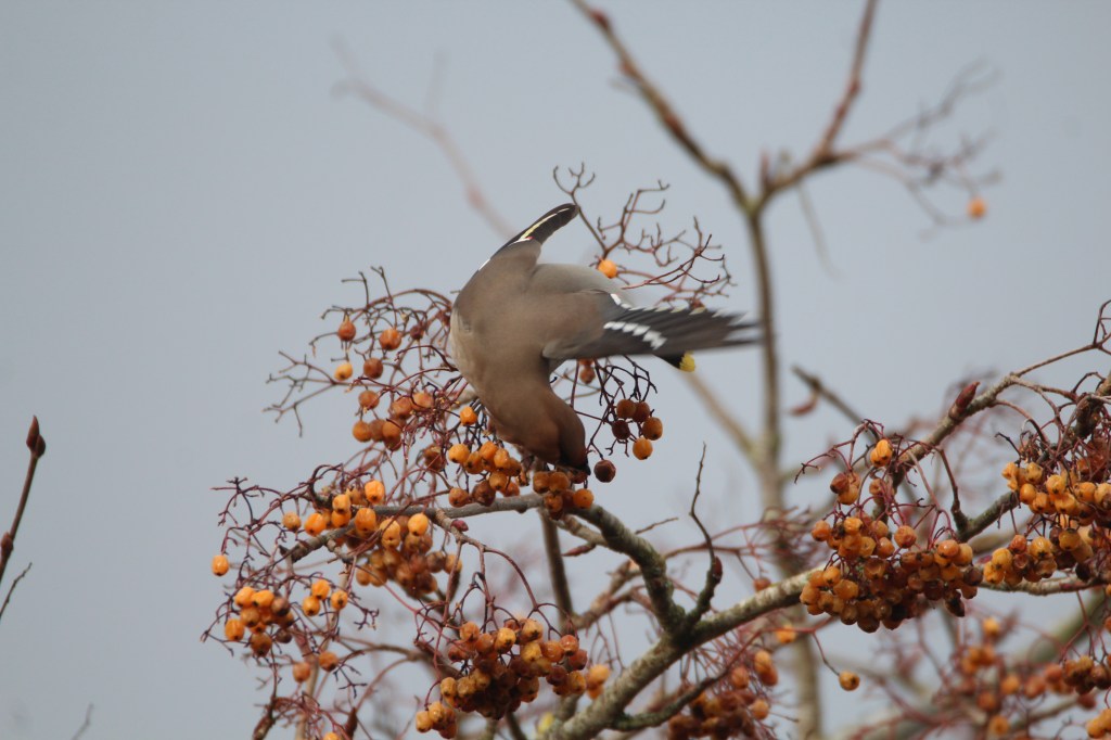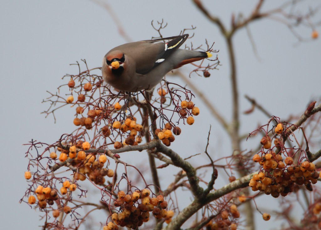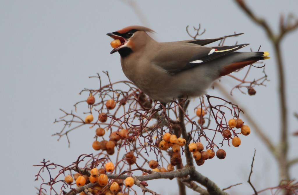 Waxwings mainly eat berries, especially rowan berries like these. They also love apples which have been left on the ground. They can get quite drunk if they eat too many fruits which have begun to ferment.