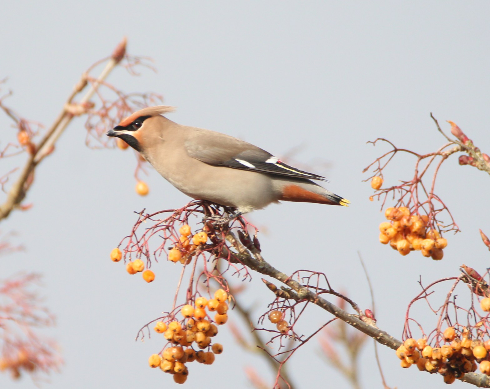 Waxwings mainly eat berries, especially rowan berries like these. They also love apples which have been left on the ground. They can get quite drunk if they eat too many fruits which have begun to ferment.