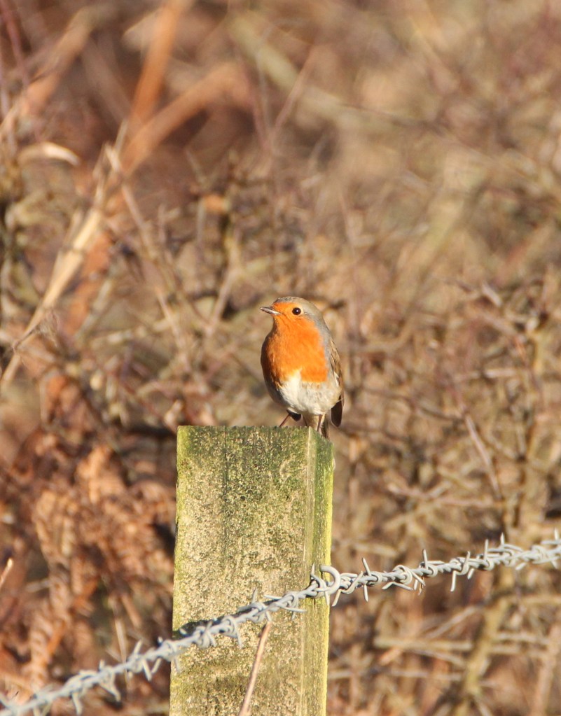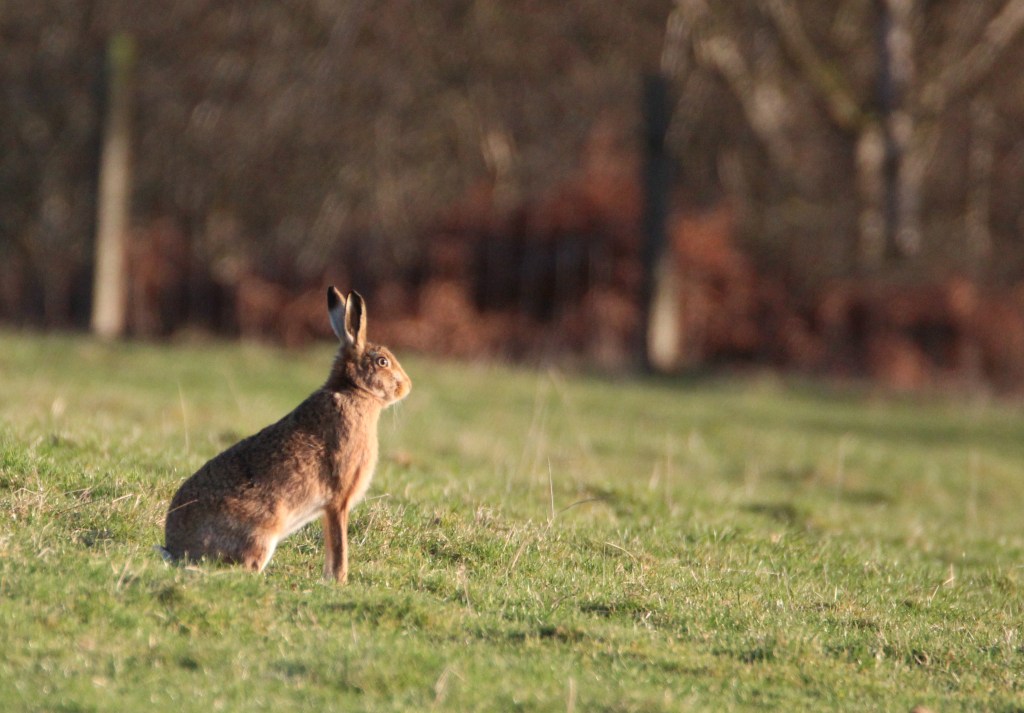 The “golden hour” for nature watchers and photographers is the hour at the beginning or end of the day just after sunrise or just before sunset. Then the light is low and takes on a magical golden quality. Here are some photographs taken this winter at both ends of the day. Below is a brown hare sitting upright, all senses on high alert.
