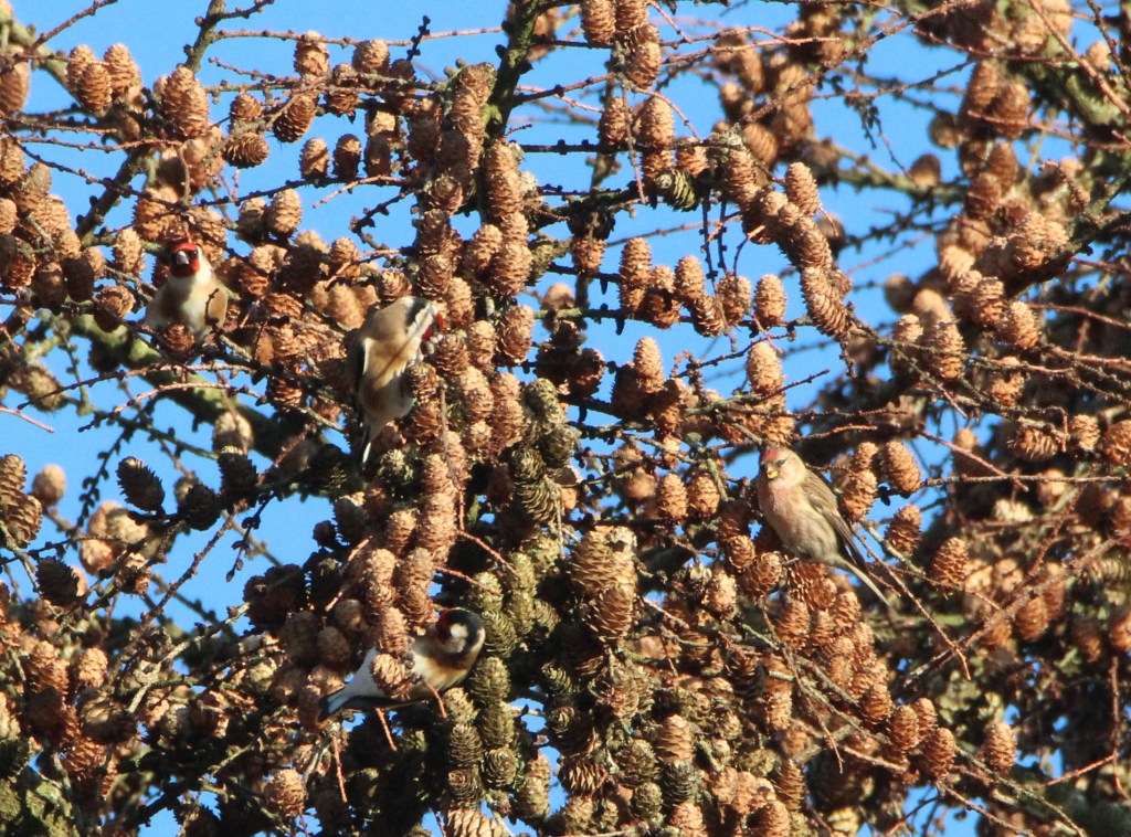 I spotted this redpoll in amongst a charm of goldfinches feasting on seeds from these pine cones.