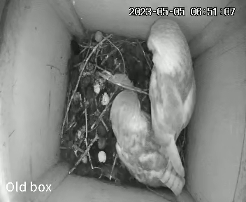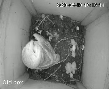 In just over three weeks there have been dramatic changes in the barn owl box. On 5th May the first chick hatched out of its egg. The parents looked rather astounded!