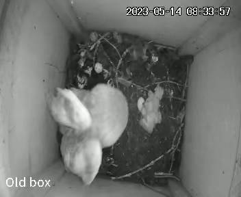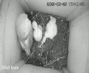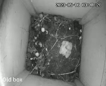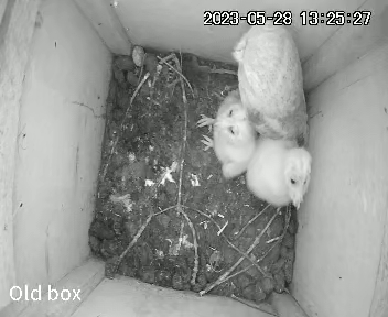 Yes, the last egg hatched. Surely they couldn’t all survive though, even with a plentiful supply of food? I watched carefully to see what would happen. Here the mum has left the box to stretch her wings and you can see a clump of fluffy owlets huddling together for warmth.
