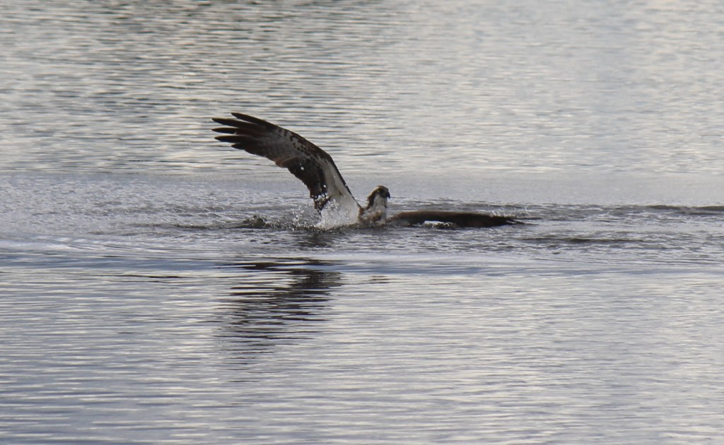 But then when we were sat down on a bench having our sandwiches another one appeared and flew in close to us. I thought it would just be the thing if it caught a fish in front of us when I didn’t have my big lens. Suddenly the nearby coots squawked with alarm as the osprey plummeted downwards. Then there was a huge splash and I grabbed my camera. Right in front of us the osprey struggled to make it out of the water with its catch. Ospreys do sometimes drown as they are pulled down under the water by the weight of the fish and become too waterlogged so I was a bit worried.