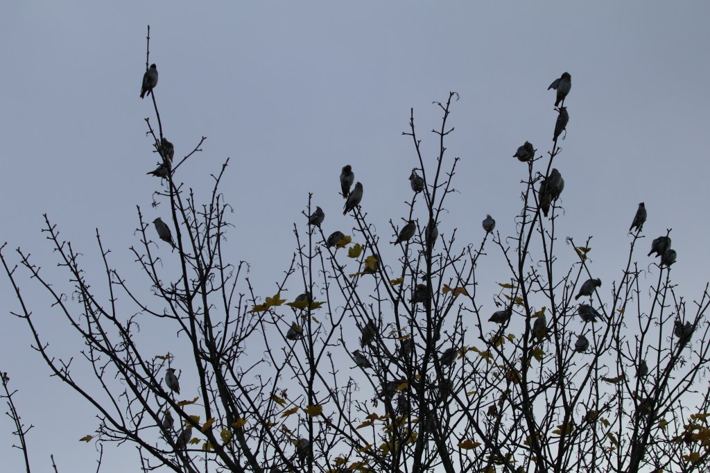 Unfortunately the light wasn’t too good when the waxwings were in view. Here they are with a grey rain cloud behind them.