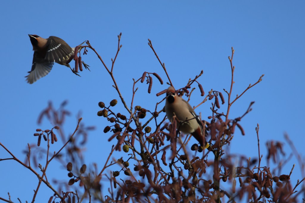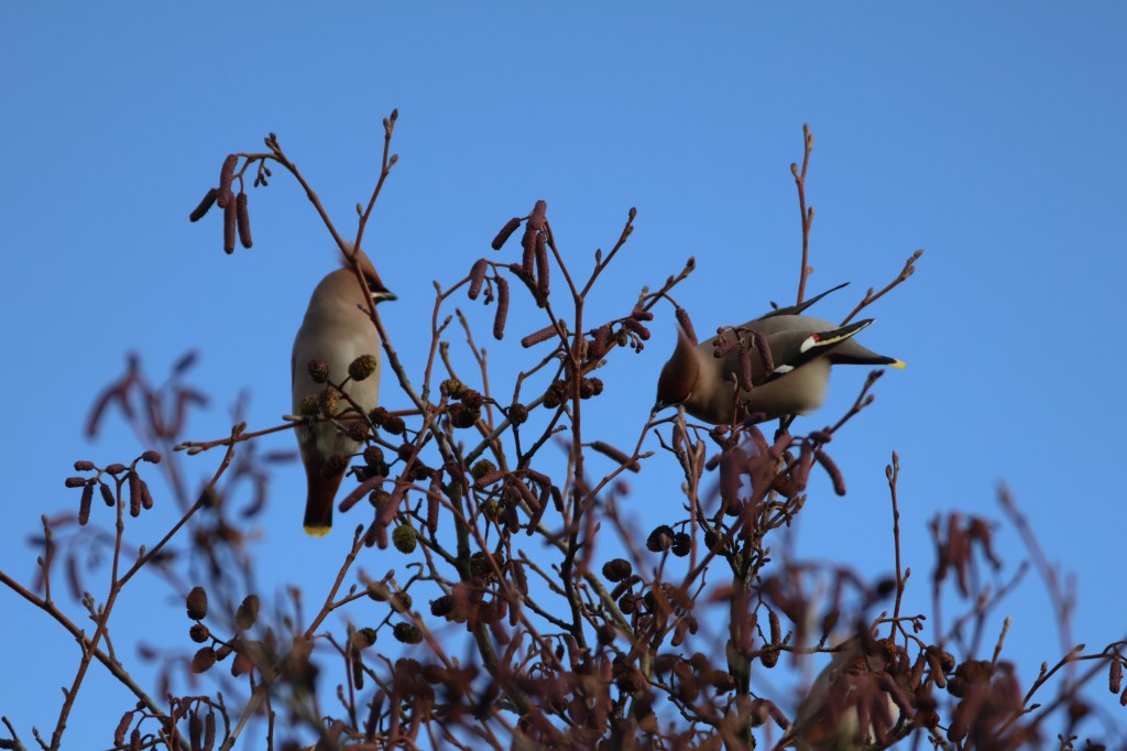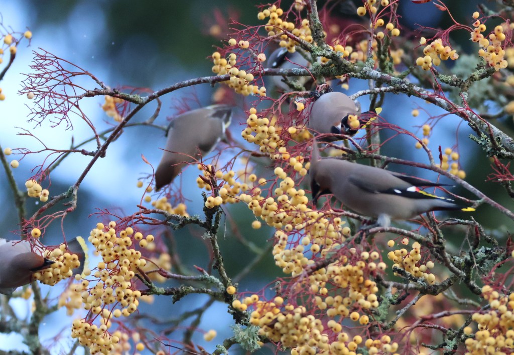 They’re back…bohemian waxwings blown in from the east from Scandinavia to plunder autumn berries. Hundreds have been seen in Elgin and these ones were from a flock of about 100 in Dunblane.