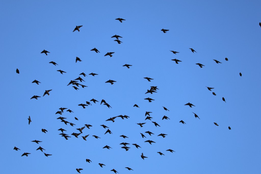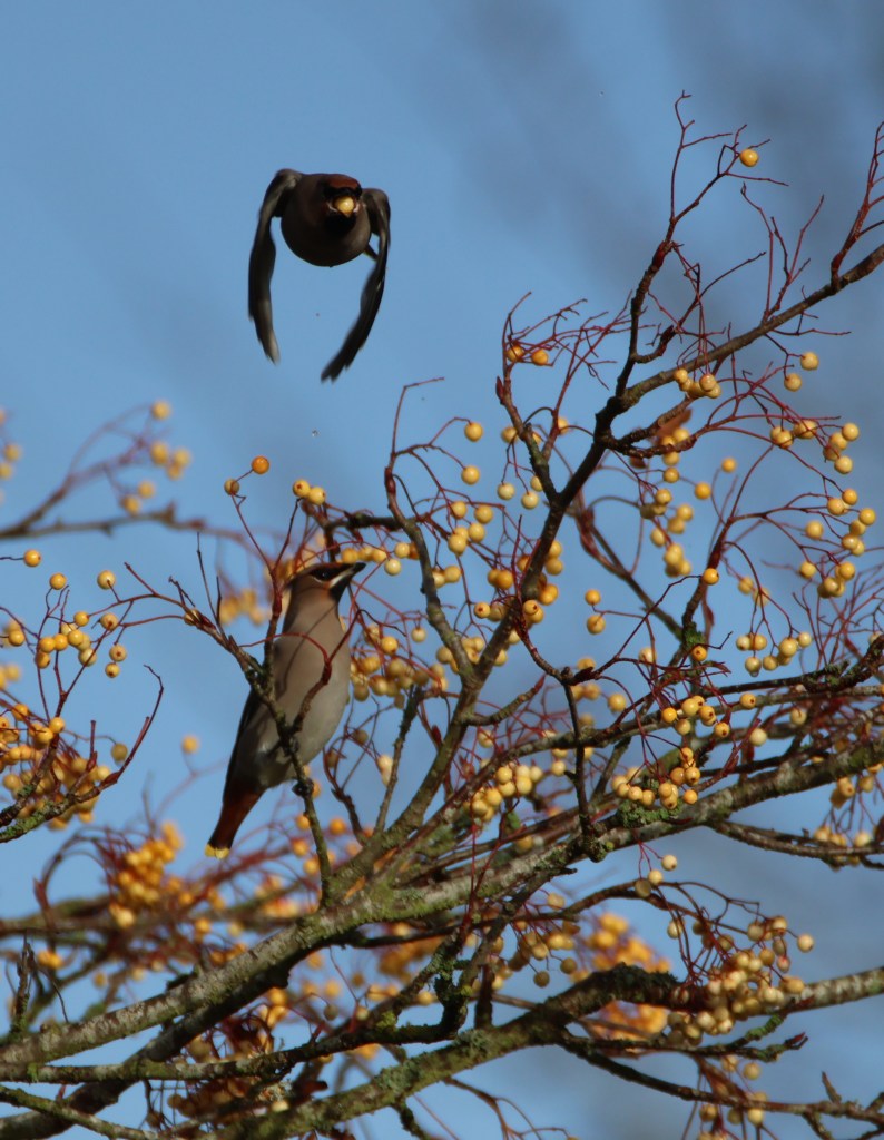They would sit perched in a tree close to the berries but when a train went in or out of Dunblane station they would take to the sky in a huge flock and fly around trilling before settling down again.