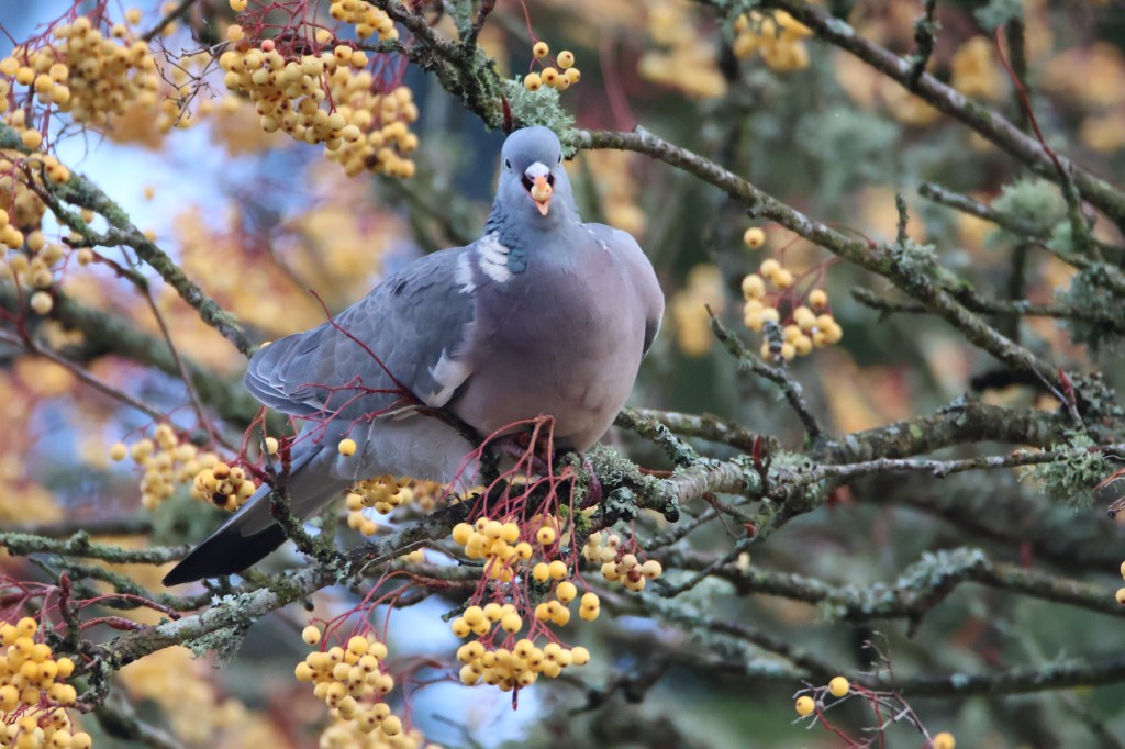 Ironically the pigeon and bullfinch appeared when the light was at its best. I stood poised with the big lens in sunshine waiting for the waxwings to reappear but they wouldn’t oblige in the sunshine. I had some place else to go so had to leave it for another day. I’m hoping this winter will see an “irruption” of waxwings, that is when huge numbers come into the country. I can’t complain though, this is the best show of them I’ve ever seen yet.