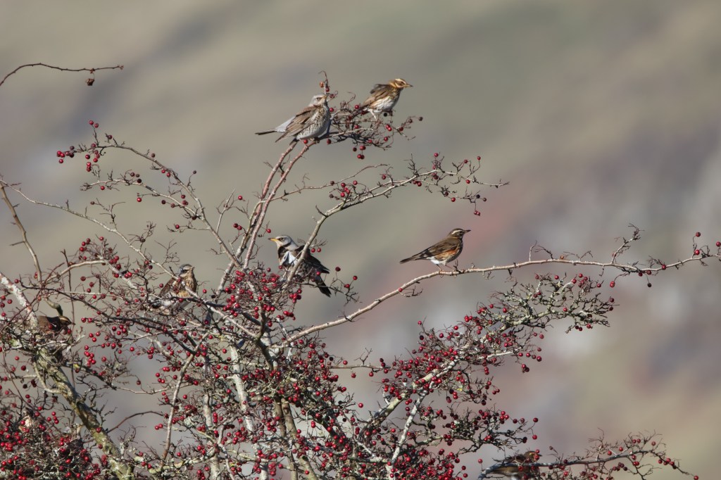 At this time of year the hawthorn and other berry bushes are visited by fieldfares and redwings, visiting winter thrushes from Scandanavia, Russia and Iceland. You can hear the “chuck, chuck” sound of the fieldfares, which move around in flocks. Sometimes you see them pecking about on grassy fields.