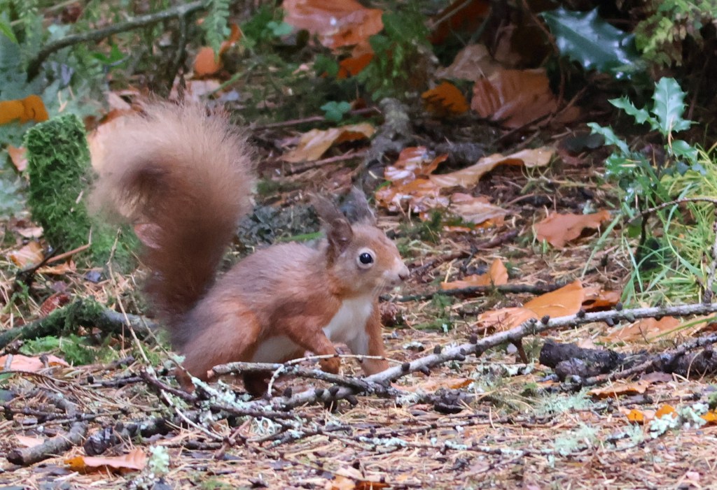 As well as the birds it’s a pleasure to see red squirrels out and about collecting nuts to cache for winter. Here is one scampering on the ground in Queen Elizabeth forest in the Trossachs.