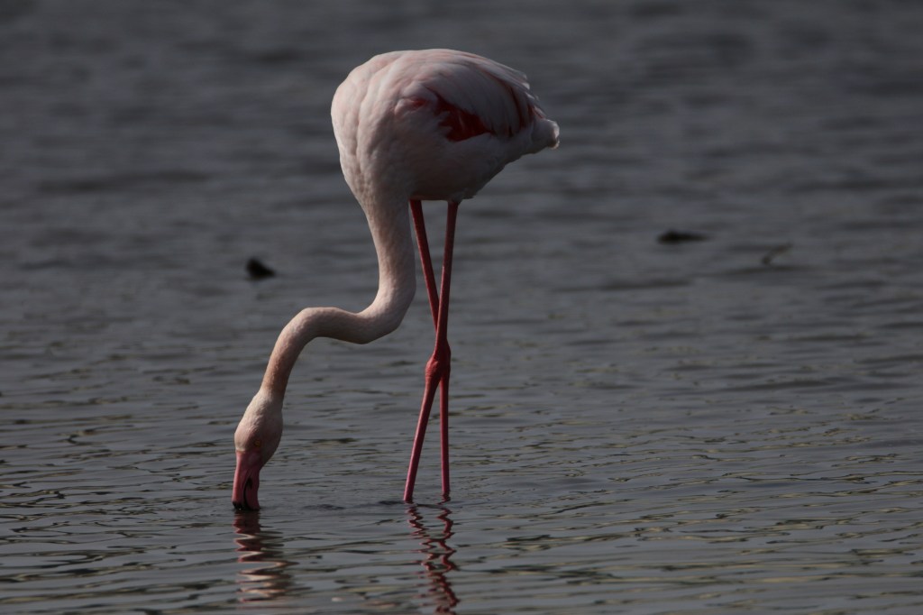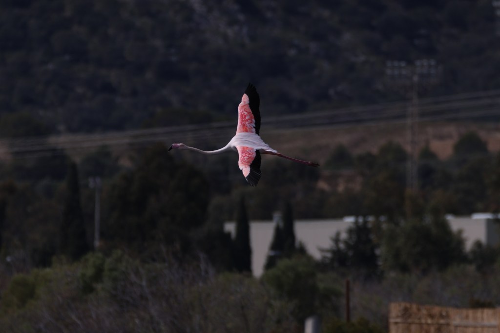 We walked down to where we’d seen it flying towards and lo and behold found a lake with about a hundred flamingos all gathered. This was no “flamingo land” park, these birds were in the wild, having flown up to overwinter in Mallorca from Africa. I had no idea there were flamingos to be found in Europe. In 2022 the European population of “greater flamingos” was estimated to be between 45,000 and 62,000 pairs. Here is one touching down on the lake.