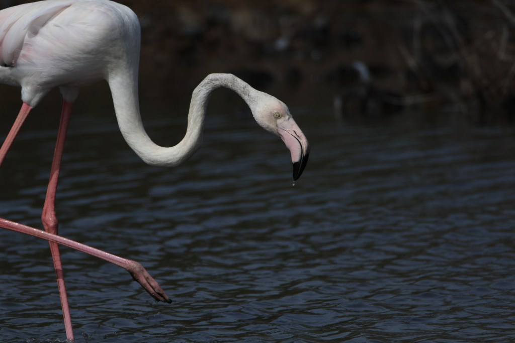 Here is a close up of one, showing its remarkable neck and its large pink and black tipped beak. Its beak acts as a filter, straining their food out of the water.