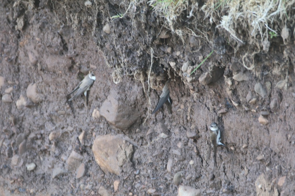 Another spring migrant which comes here to breed is the sand martin. You can hear their high pitched chatter as they wheel around above your head. We have them nesting in holes in a sand bank up beside a stream. For me they are almost impossible to photograph as they flit around so fast, barely ever stopping. So I tried to capture them as they paused momentarily at their nest holes in the bank.