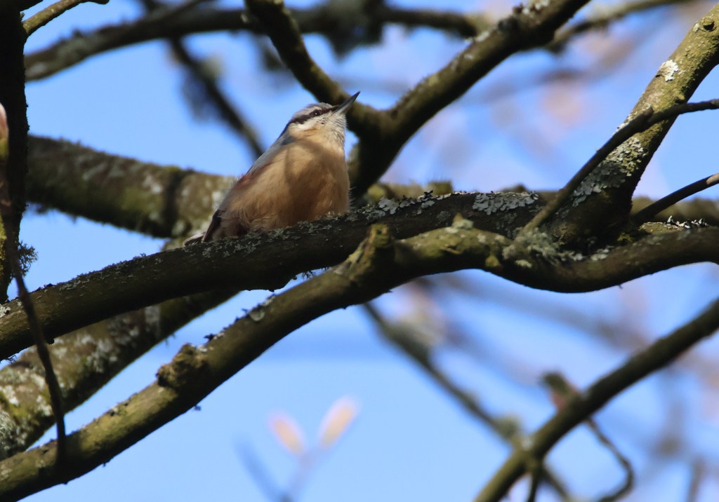 Nuthatches also have very distinctive calls which can help you find them. Here is one high up in a tree. Often they crawl beak first down tree bark, pecking out insects.
