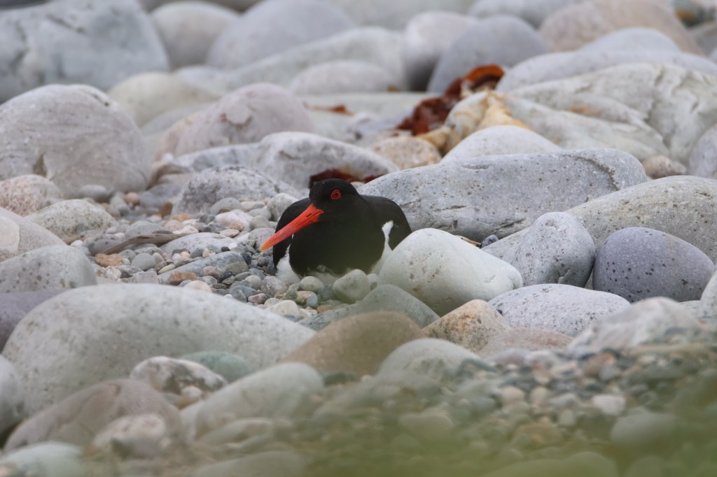 This oystercatcher doesn’t bother with twigs but lays her eggs in amongst the rounded stones.
