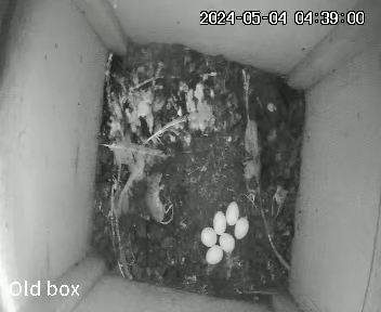All is well in the barn owl box, although due to a technical hitch its only this last week or so that I’ve been able to check in on it. At the start of May Marny left the nest for a few minutes to reveal six white eggs. Also a lovely juicy mouse for breakfast!