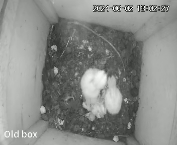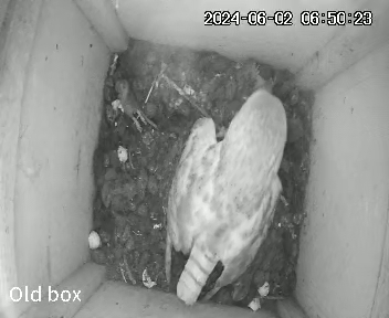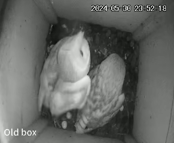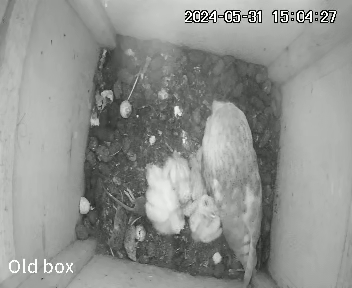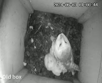 I was worried that I had not seen Barny whilst scrolling through the video footage. Had something happened to him? Was Marny having to leave the chicks each night to hunt because he was no longer there? However I caught a fleeting glimpse of Barny the other night. He drops food into the box but does not hang around. It’s just a quick “deliveroo” and he’s off again.