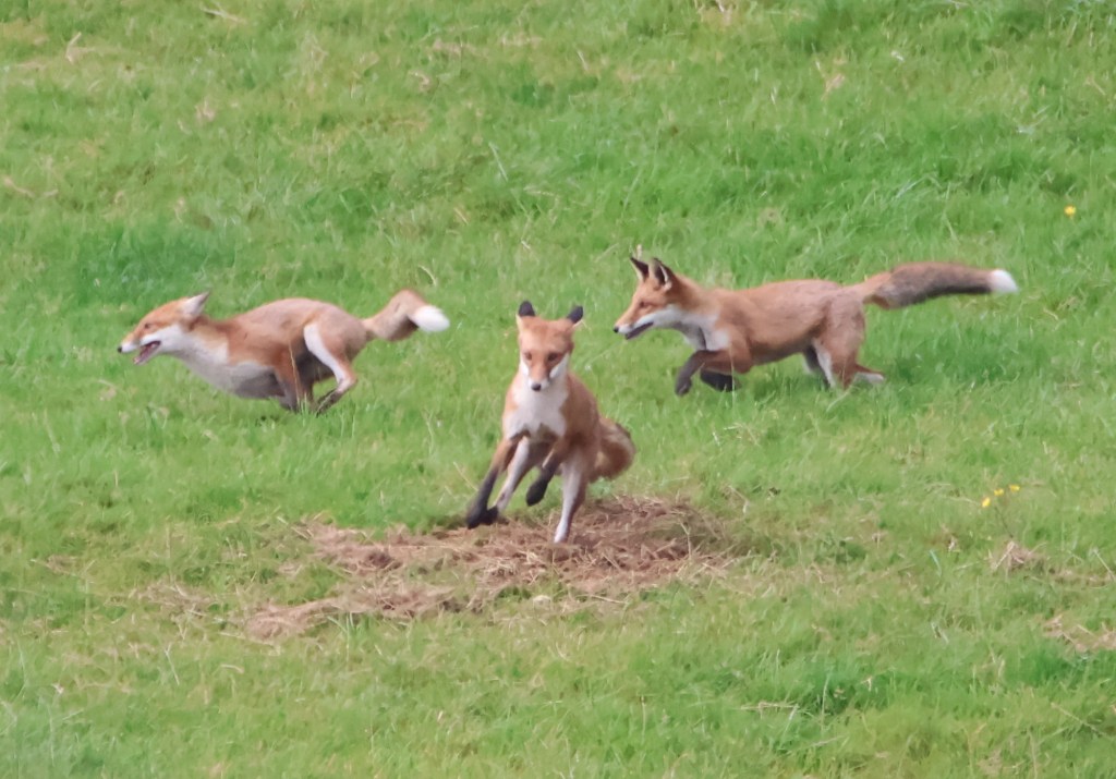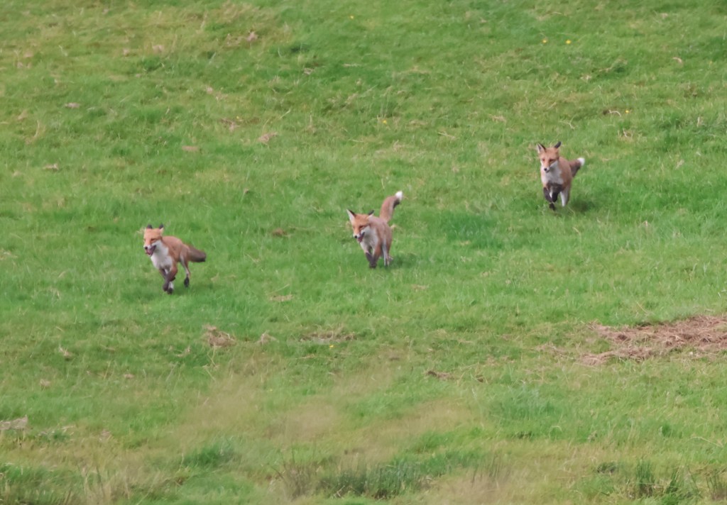 I was walking by the river Kelvin today hoping to catch sight of a kingfisher. None was seen but I was delighted to spot four cavorting fox cubs in a field on the other side of the river. What an absolute joy to watch them at play, chasing, leaping, wrestling and rolling. They were a distance away but the big lens did its job and I have cropped the photos to give closer pictures.
