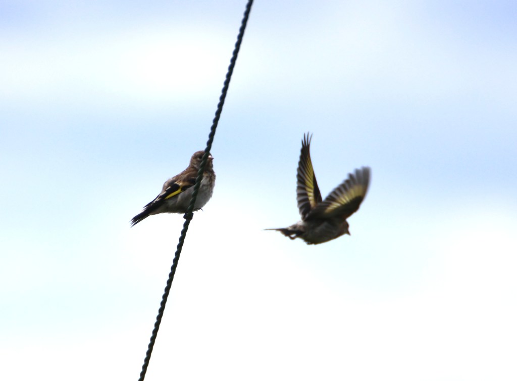 I often hear the piping and squeaking of goldfinches before I see them. Here are a couple taking off from a wire.