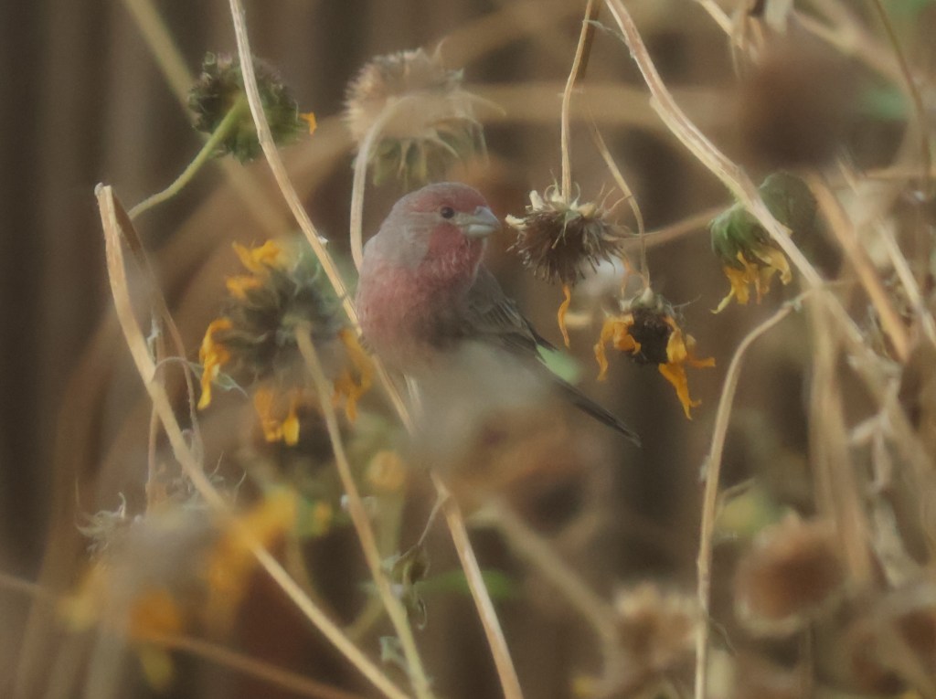 In Utah some small birds were making the most of autumn sunflower seeds. One was a common rose finch.