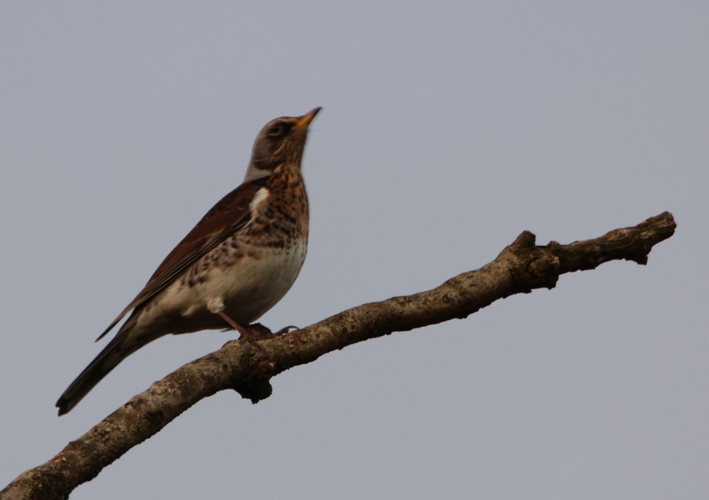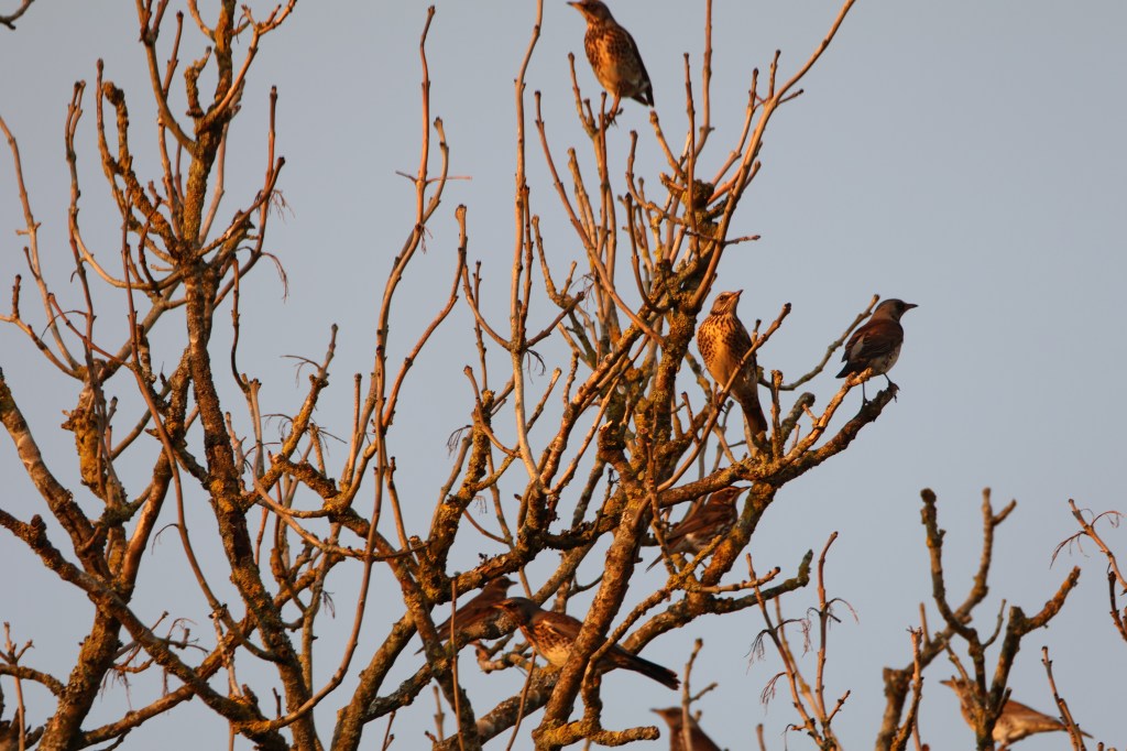 It’s not just the big birds which migrate in winter. Fieldfares from Scandinavia are a common sight and sound in the hedgerows. They make a distinctive chooking sound and are shy of passers by, flying off when ever approached.