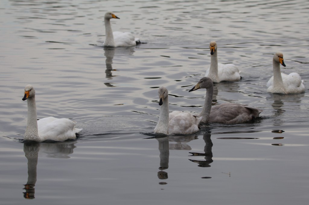 The whooper swans have flown in from Iceland to spend the winter here. Down in an English nature reserve they have seen thousands, however I was pleased to see seven at my local Hogganfield Loch. There are a couple of young ones in the group whose grey plumage is gradually changing to white.
