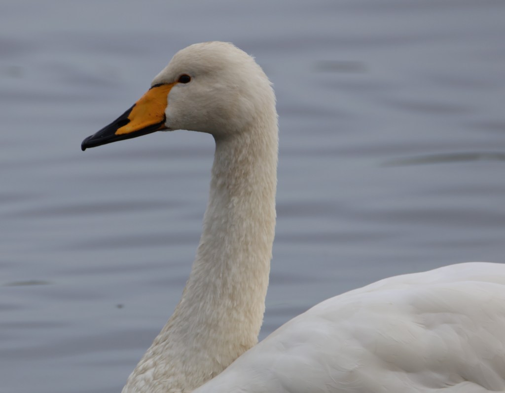 Whooper swans have yellow beaks which set them apart from the orange beaked mute swans. (Bewick swans also have yellow beaks but their yellow marks are more like knobs of butter than the cheese shaped yellow wedges of the whoopers.)