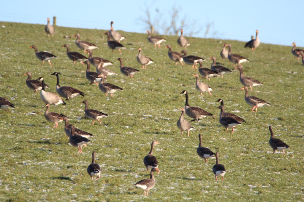 Other winter returners are geese. At this time of year you can see large flocks of geese grazing in fields. The two most common ones are pink footed geese and the black and white canada geese, often found together as in the next photo.