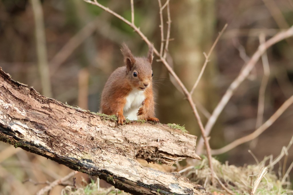This month we visited Morton Lochs, part of Tentsmuir nature reserve in Fife. Around the lochs there are several hides from which to watch the wildlife and what I was really hoping to photograph was a kingfisher. However the lochs had been frozen and no kingfishers had been seen there since December. I’ll need to return in the spring. What we did get a good sighting of was a red squirrel, feasting on nuts left out on a log.