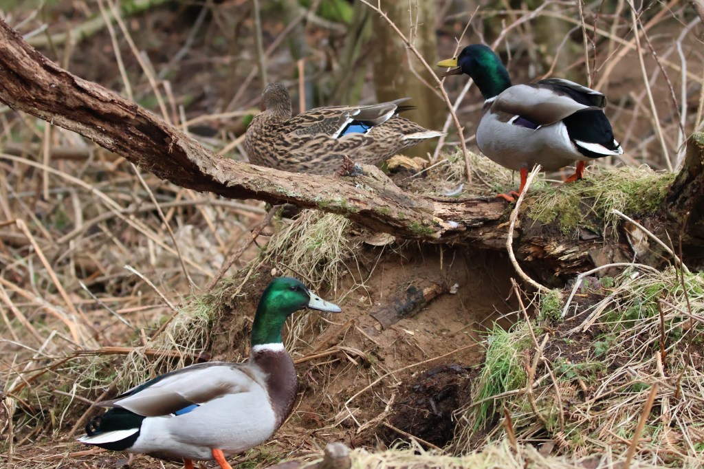 A group of Mallard ducks came waddling over to the log and chased the squirrel off.