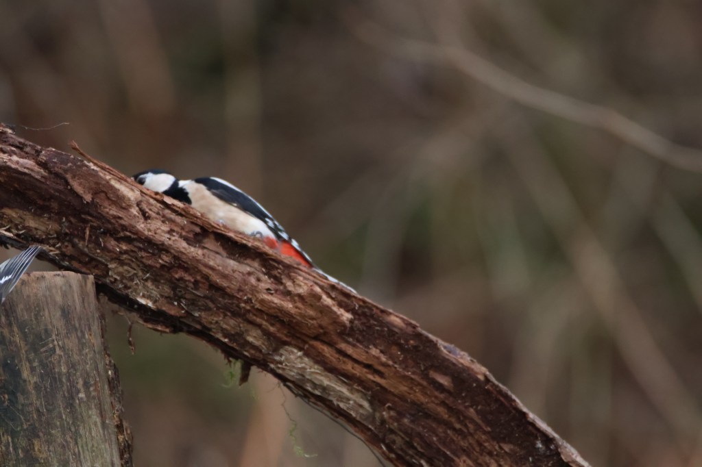 Then a great spotted woodpecker came on the scene. First it alighted on a nearby tree.