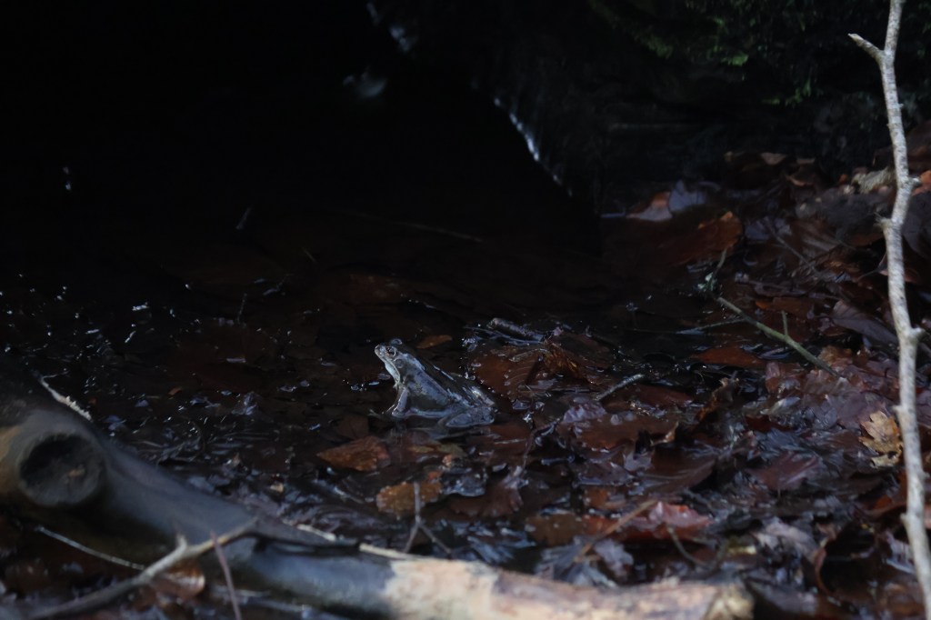 Today has been an exceptionally mild day for the start of the second week of March. As well as blackbirds starting to sing I heard frogs croaking and purring close to the edge of the Alloch Dam where I live. As I got close to the sound I started to make out these slimy amphibians gathering and calling to each other in a water channel.