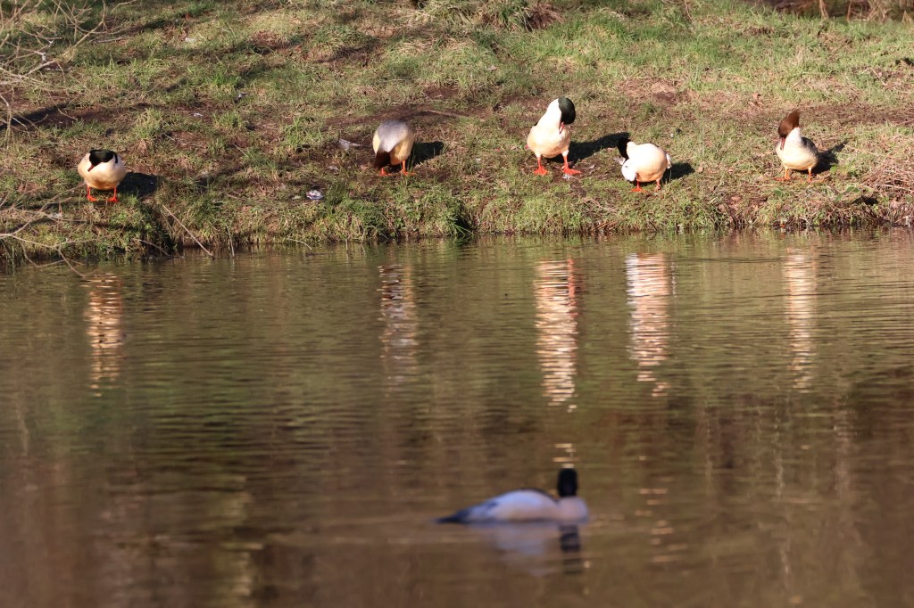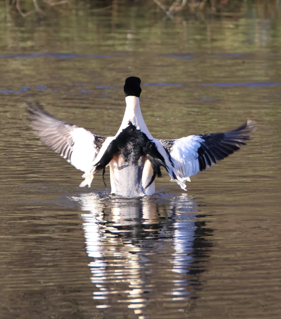 A few weeks back I came across about a dozen goosanders mingling on a pond close to home. I’d never seen them there before and they didn’t stay long. However on one sunny afternoon they seemed to be having a bit of a preening and pairing up party.