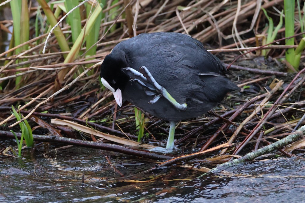 There are always lots of coots tooting around on the water. Here is a close up of one scratching an itch with its dusky blue foot.