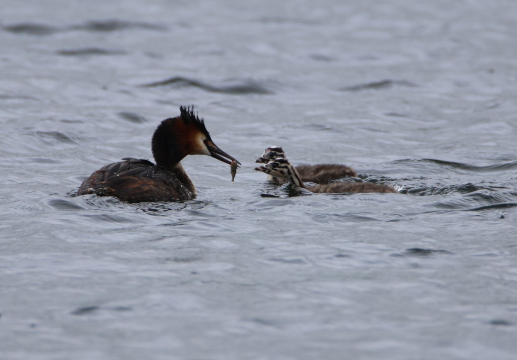 The crested grebe chicks are now too big to be hitching rides. But they are still depending on their parents to feed them tiddlers for tea.