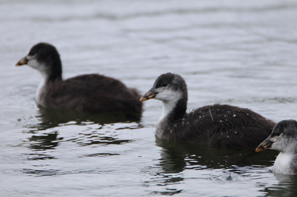 The coots chicks had developed into grey and white plumage.