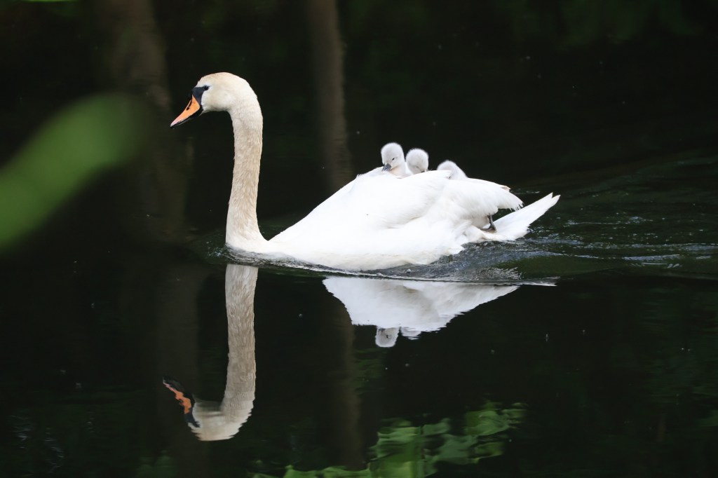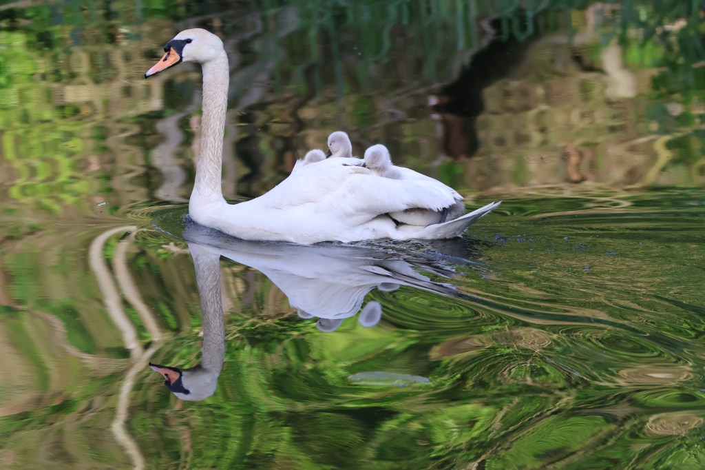 Tonight, instead of watching “Springwatch” on TV we went out to enjoy the sunny evening and see what we could observe on the canal. All was quiet and I was just saying, “I hear there’s some cygnets been seen…ooaah, and there they are!” Coming round a bend towards us was a swan with a group of about 4 or 5 cygnets following behind. Just as I whipped my camera out of my rucksack all the cygnets bar one climbed up onto their Mum’s back for a ride. Mum was in quite a hurry and the last wee one was paddling frantically at the rear trying to keep up.
