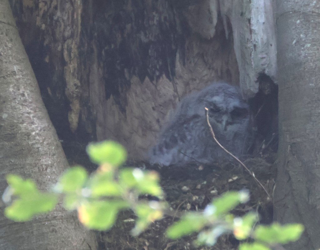 After weeks of watching I finally saw an owlet in the tawny’s nest in the wood. Two years ago I saw three owlets in the nest but it appears that this year there is just the one. Or is that another owlet tucked in behind it? Other siblings may have branched out from the nest in the last week or so when I was away. I’ve not seen any in trees or bushes around though.