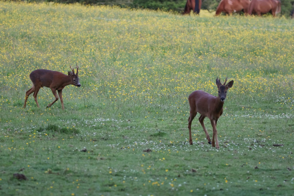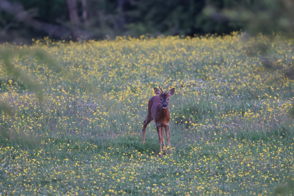 I’ve not seen the fawns again. I suspect they are tucked safely out of view in the barley field. However some young bucks were out foraging in the buttercup field the other evening. They came quite close.