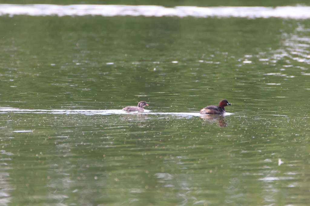 Sadly the cygnets on the pond are no more. The swan couple are alone. The cygnets must have been predated. Hopefully this little grebe chick will fare better.
