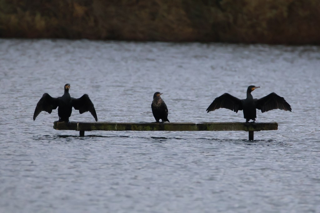 Three cormorants were perched on a log, the two end ones drying out their wings.