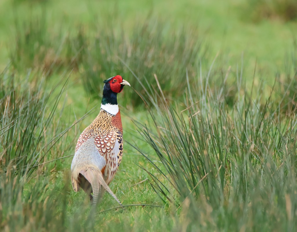 Some male pheasants were squaring up to each other inside a large bush and they made the most peculiar growling sound as they did so. This one however was showing off its remarkable plumage out in the open.