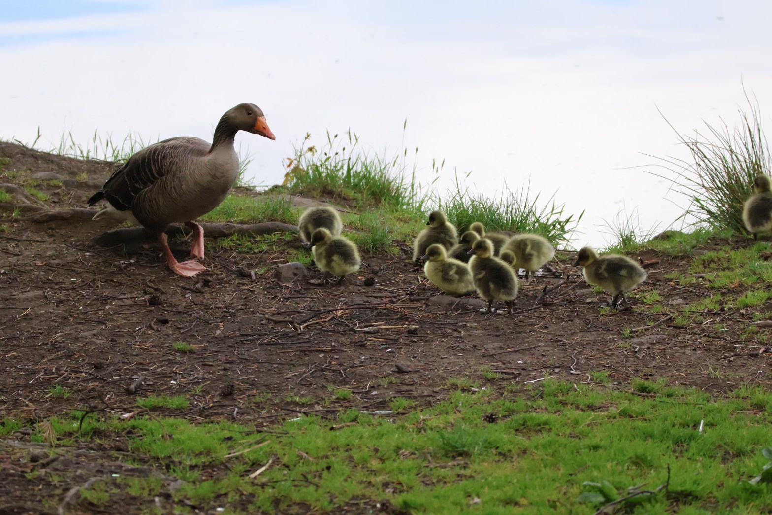 The other day we witnessed a wee gaggle of greylag geese and eleven fluffy goslings trying to reach the pond for a swim. We first came upon three adults and one gosling on the path in front of us. The adults seemed to be encouraging the youngster to go back to the group it hadContinue reading “Goosy Ganders”